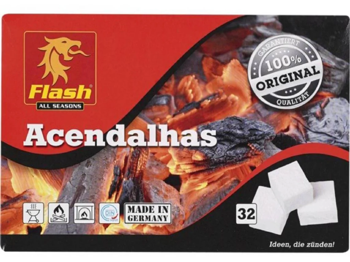 Embalagem de acendalhas Flash All Seasons com selo 100% Original e imagem de fósforos acesos