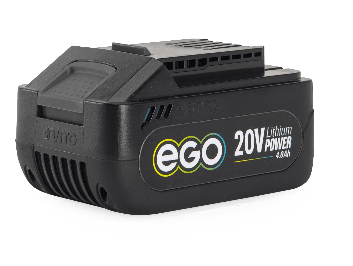 Bateria recarregável preta EGO 20V Lithium POWER 4.0Ah sobre fundo branco