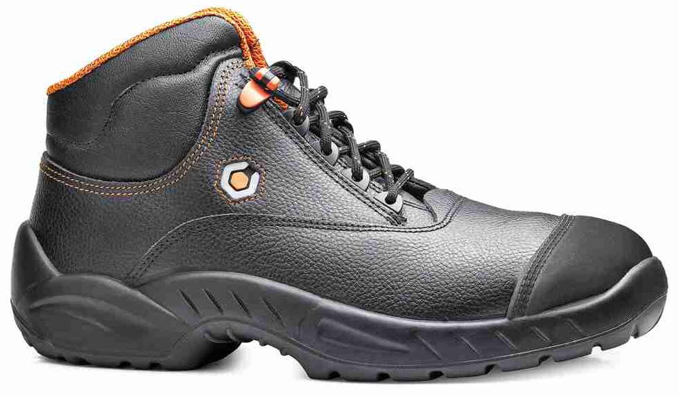Bota de segurança preta com detalhes em laranja e sola robusta