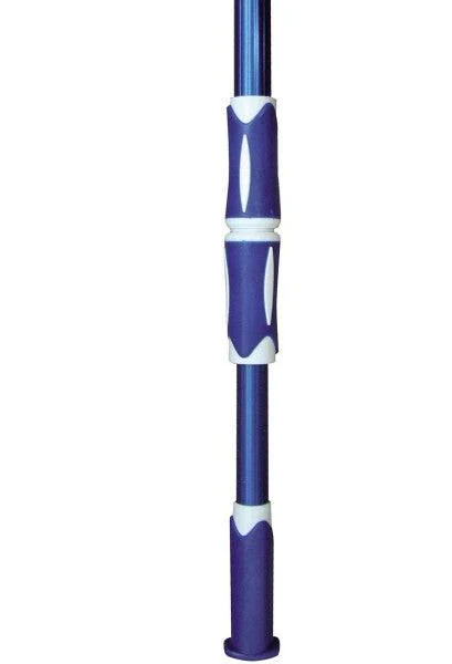 Duas bengalas ajustáveis com punhos azuis e detalhes brancos, em fundo branco