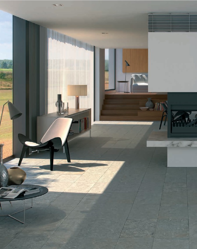 Sala moderna com cadeira preta, mesa redonda, candeeiro de mesa e lareira, chão em pedra cinzenta e janelas amplas