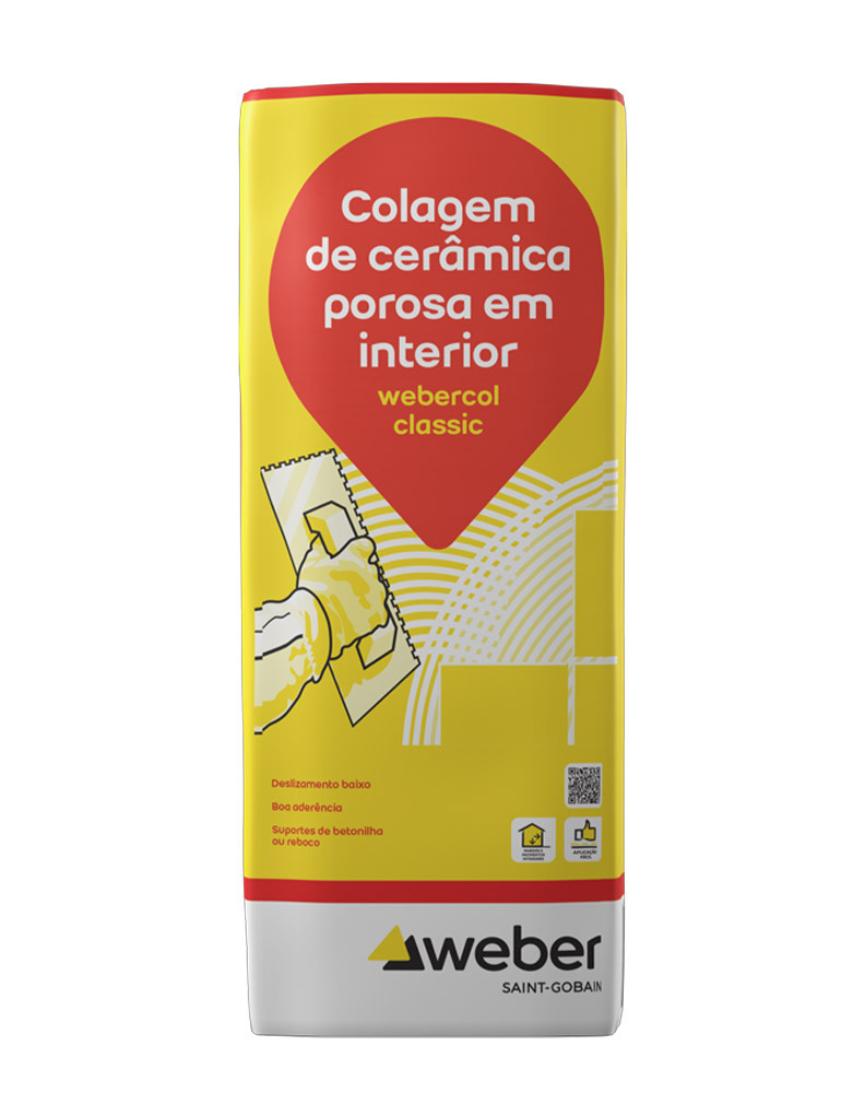Embalagem de colagem de cerâmica porosa Weber Webercol Classic em amarelo, vermelho e branco