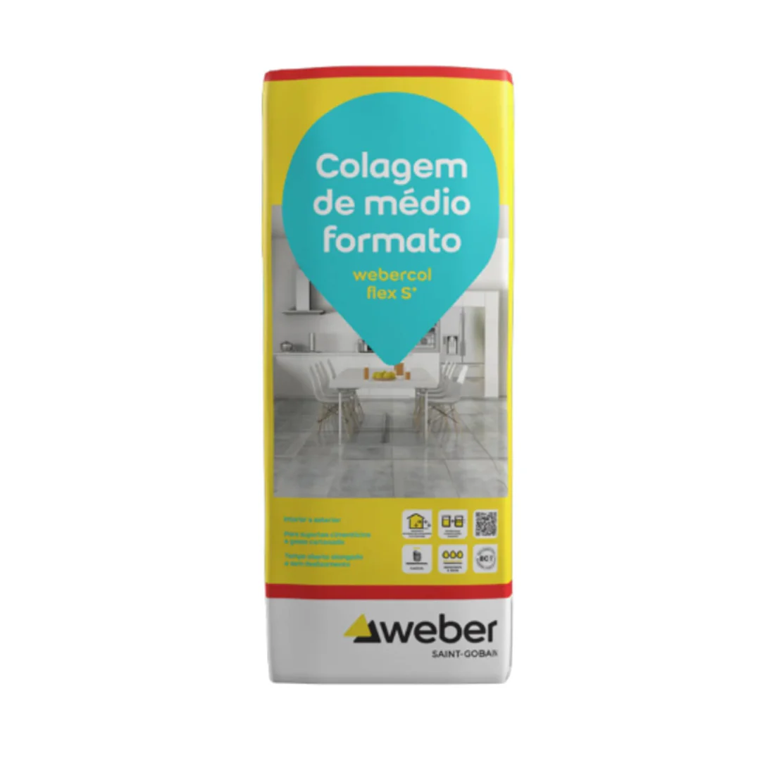 Saco de cimento cola para cerâmicas e azulejos webercol flex XS em embalagem retangular amarela, branca e vermelha